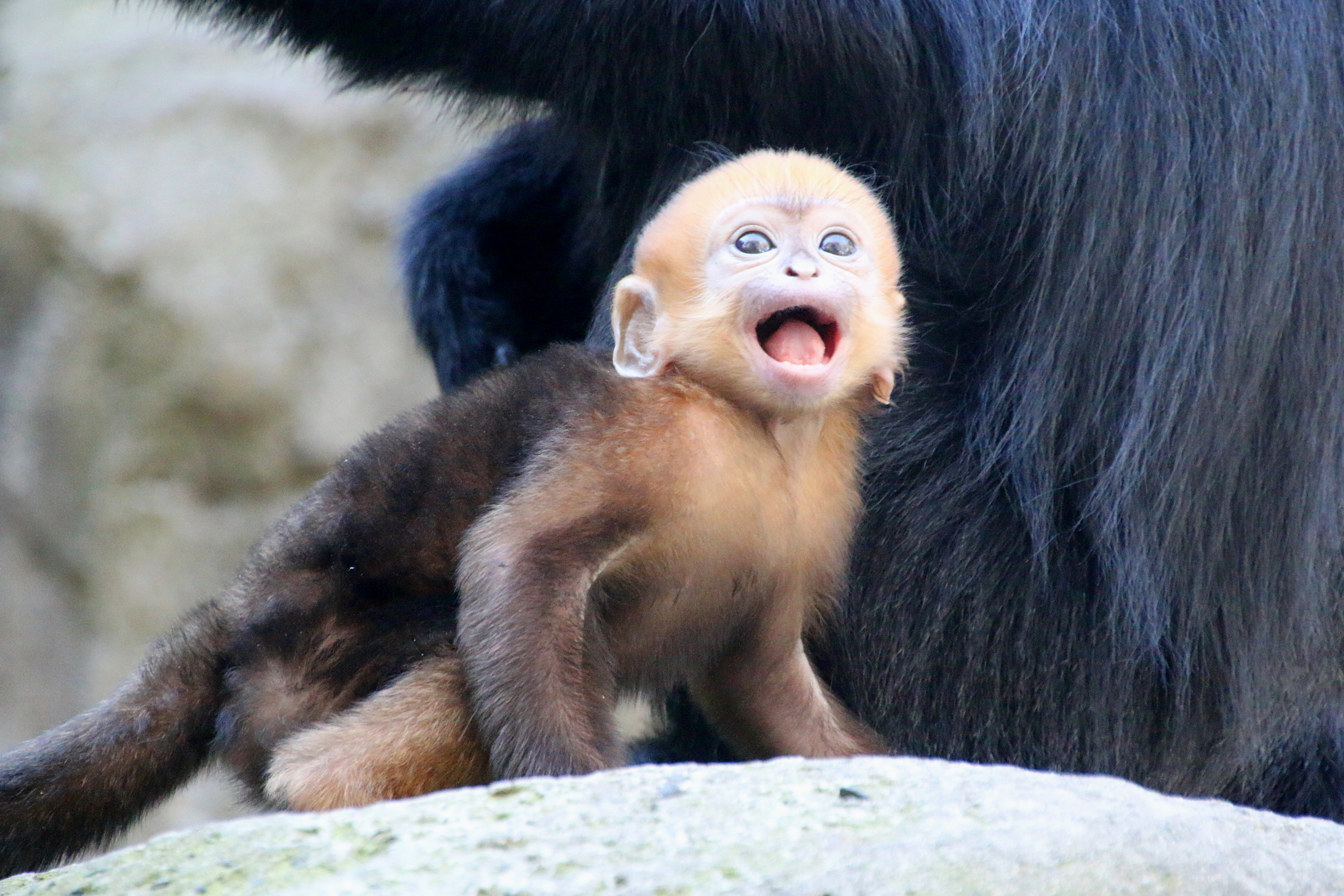 Like all young François Langurs, Embe was born with distinctive bright orange hair, a stark contrast to her parents’ black colouring. It’s believed the colour distinction makes it easier for adults to identify and look after infants.